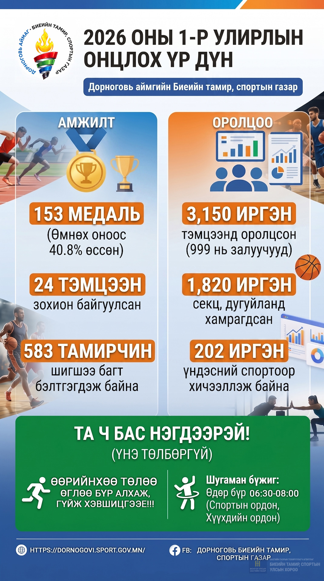 Биеийн тамир, спортын газрын 2026 оны 1-р улирлын онцлох үр дүнгээс танилцуулж байна. Өнгөрсөн 3 сарын хугацаанд нийт 3,150 иргэн тэмцээн уралдаанд идэвхтэй оролцож, манай тамирчид 153 медаль хүртсэн бахархам амжилт гаргалаа.