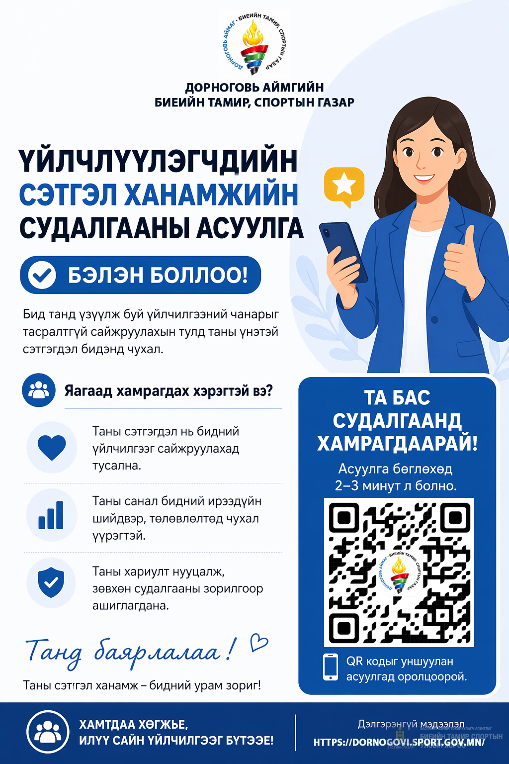 Дорноговь аймгийн Биеийн тамир, спортын газар таны санал бодлыг сонсохыг хүсэж байна!